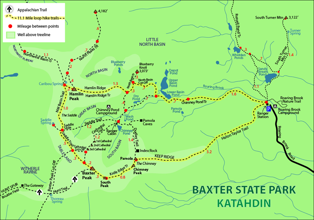 The trail map below shows a big 11.1 mile loop hike over Pamola, Chimney, South, Baxter and Hamlin Peaks in Baxter State Park. Click the link below for a detailed PDF downloadable map. Note: This highlighted hike below goes over Knife Edge Trail which can be extremely dangerous in certain weather and wind. Use caution.